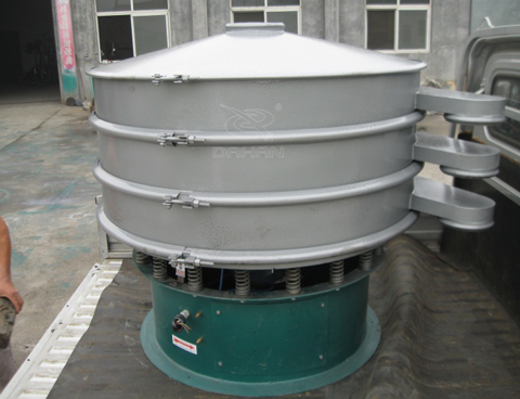 Φ1000型振動篩為直徑1000mm的兩層三個出料口振動篩,子母網分離式網架,接觸物料部分以及防塵蓋均為304不銹鋼材質,底座部分為Q235碳鋼材質。