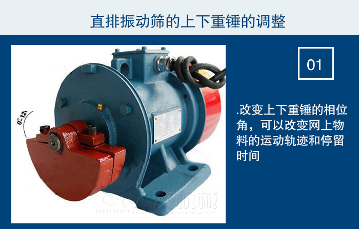 1.改變上下重錘的相位角,可以改變網上物料的運動軌跡和停留時間。為是篩機適應各種物料所需求的分離狀態,如物料的分布,處理量、過網率等各種變化,應將它調整到最佳狀態。