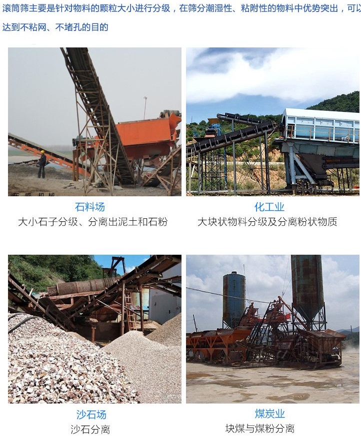 滾筒篩由一個(gè)穿孔的圓柱形滾筒組成,該滾筒通常在進(jìn)料端以一定角度升高,當(dāng)進(jìn)料沿旋轉(zhuǎn)滾筒螺旋向下時(shí)實(shí)現(xiàn)物理尺寸分離,其中小于篩孔的尺寸過(guò)小的材料通過(guò)篩網(wǎng),而尺寸過(guò)大的材料從滾筒的另一端排出,用于粘性和纖維材料的分類(lèi),例如在煤炭或天然石材工業(yè)中。