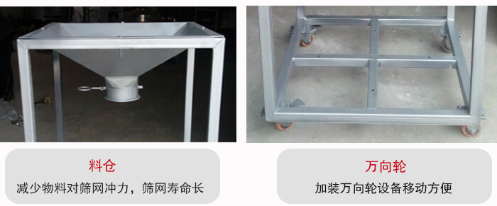 移動式料倉振動篩又叫振動篩料倉一體機底部加裝萬向輪,可360度旋轉移動。