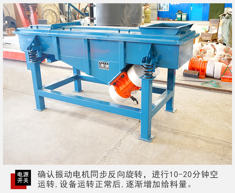 3、閉合電源開關,確認振動電機同步反向旋轉,進行10-20分鐘空運轉,設備在運行時如有異常聲音,應迅速關機進行檢查處理。設備運轉正常后,可將少量需篩分的物料通過進料口設入篩機內(nèi),確認物料向出料口方向行進,然后逐漸增加到所需和所能承受的給料量。
