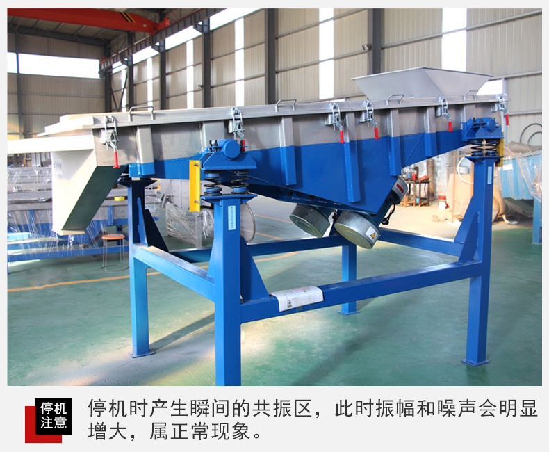 6、設備在停機時產(chǎn)生瞬間的共振區(qū),此時振幅和噪聲會明顯增大,屬正常現(xiàn)象,設備在開停機前,篩面上不得有存留物料,篩網(wǎng)需經(jīng)常檢查是否張緊、破損,如有破損要即時更換。