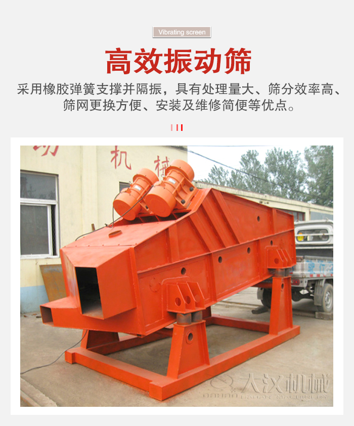 高效振動篩是利用振動電機(jī)或普通電機(jī)激振器做為振動源,使篩體沿激振力方向作周期性往復(fù)振動,物料在篩面上沿直線方向作拋物線運動,從而達(dá)到篩分目的。