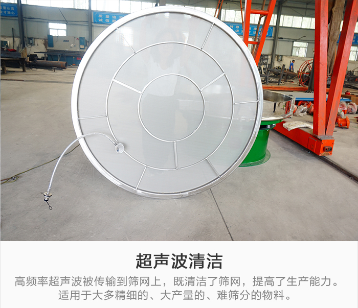 超聲波清潔:高頻率超聲波被傳輸到篩網上,既清潔了篩網,又顯著提高了生產能力。適用于大多精細的、大產量的、難篩分的物料。